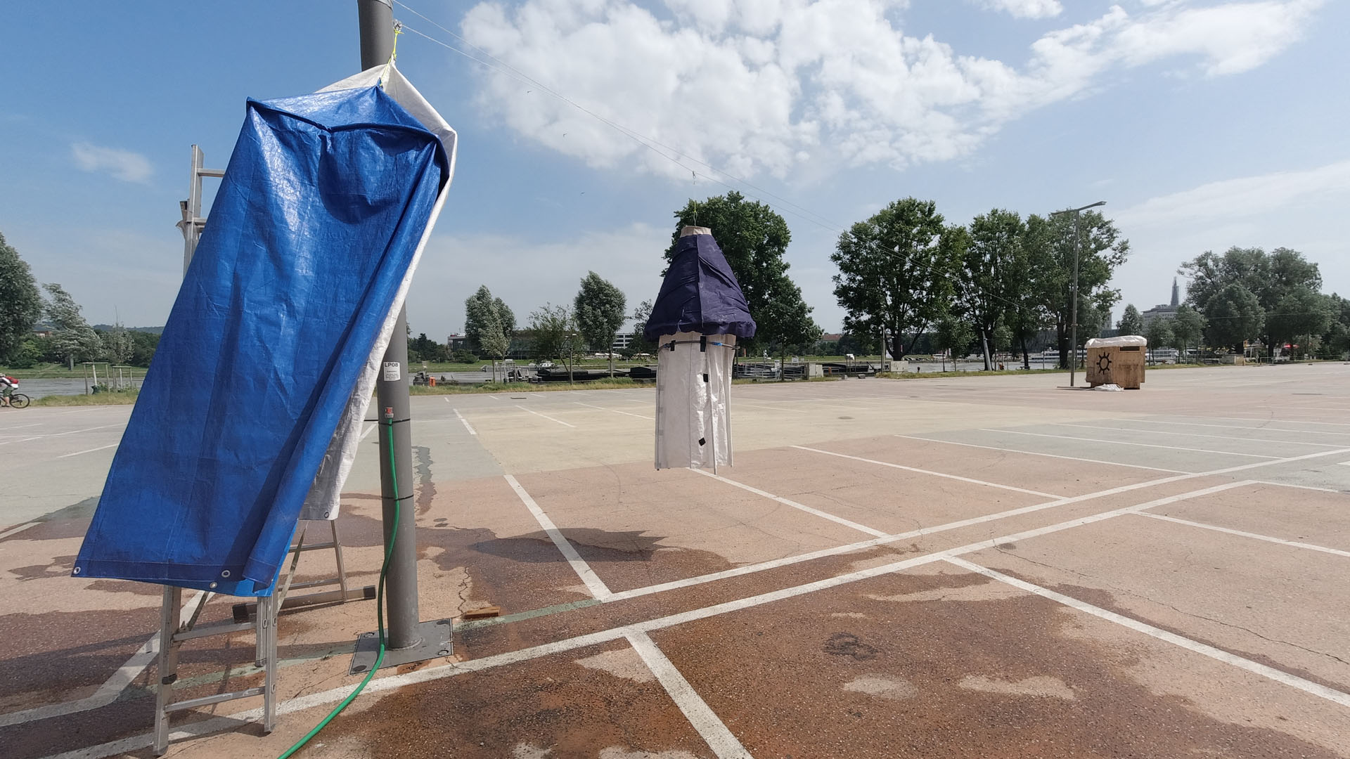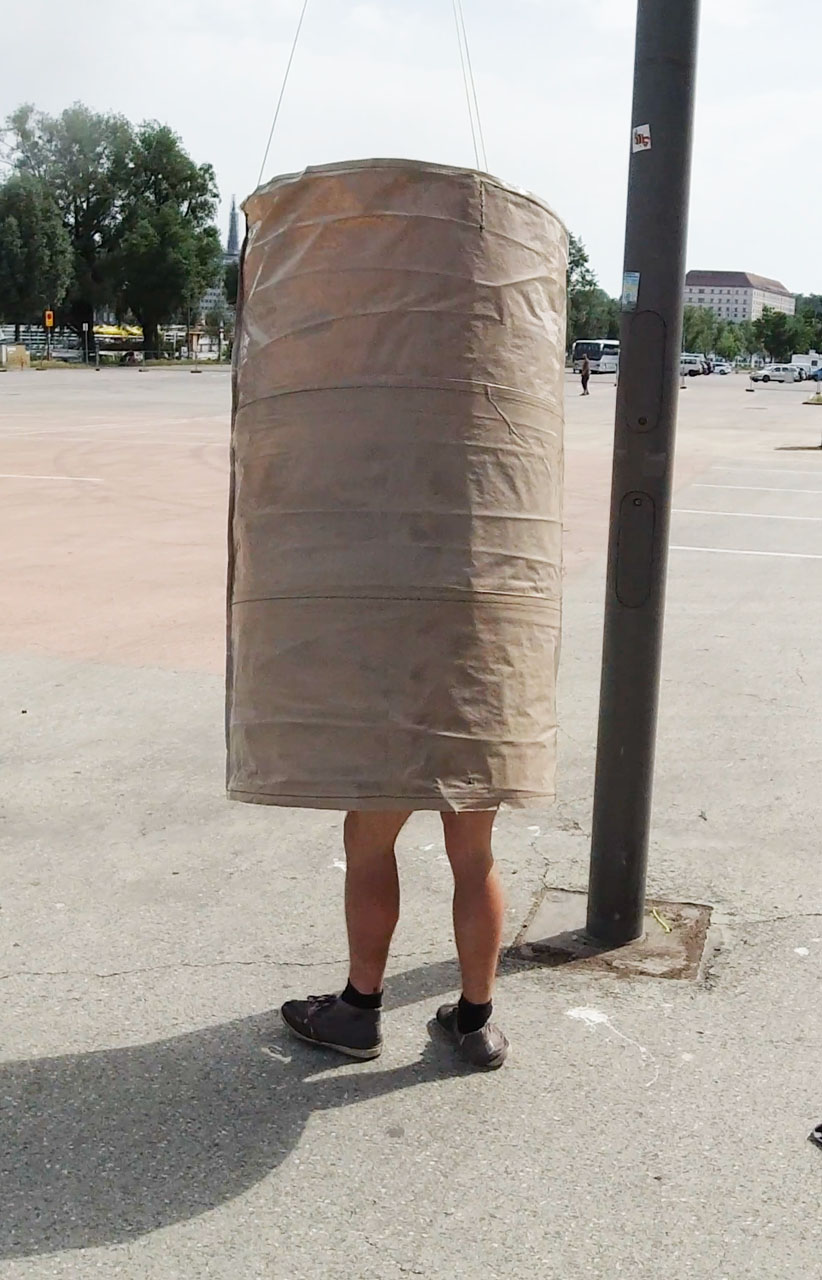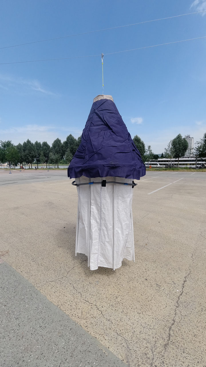 Ein mit einer Folienbadehaube bedecktes Saunahäuschen steht im Zentrum und korrespondiert mit den zwei Bereichen der Rauminstallation über ein Seilsystem, an dem flexible und über den Boden bewegliche, nutzbare Objekte befestigt sind. Die an den Seilen fixierten Artefakte dienen als Umkleidekabinen und als Zonen der Entspannung bzw. Akklimatisierung nach einem Saunabesuch. Die zwei genannten Bereiche bieten an Liegen zur Entspannung und einen Wasser sprühenden Arc de Triomphe. Durch aktive Nutzung der Elemente werden Akklimatisierung und Nacktheit zur Schau gestellt. Eine flexible Umzugskabine als sicherer Raum garantiert gleichzeitig den intimen Moment der Entblößung, der Nacktheit.