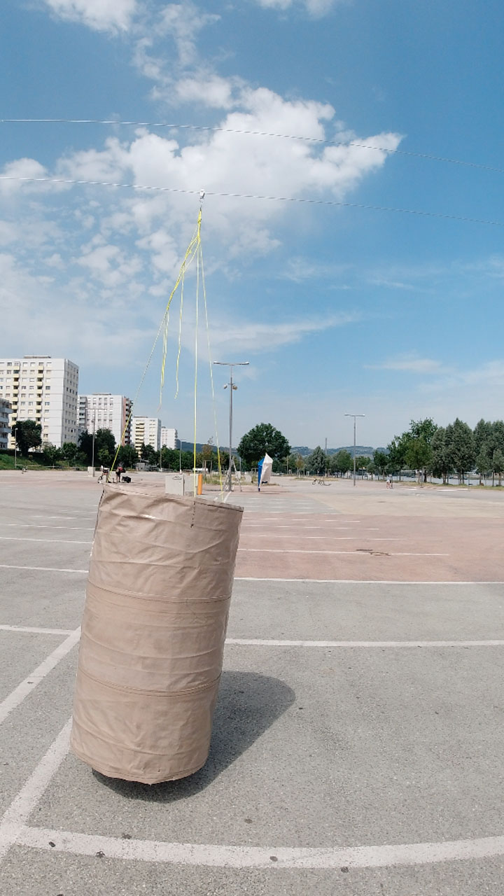 Ein mit einer Folienbadehaube bedecktes Saunahäuschen steht im Zentrum und korrespondiert mit den zwei Bereichen der Rauminstallation über ein Seilsystem, an dem flexible und über den Boden bewegliche, nutzbare Objekte befestigt sind. Die an den Seilen fixierten Artefakte dienen als Umkleidekabinen und als Zonen der Entspannung bzw. Akklimatisierung nach einem Saunabesuch. Die zwei genannten Bereiche bieten an Liegen zur Entspannung und einen Wasser sprühenden Arc de Triomphe. Durch aktive Nutzung der Elemente werden Akklimatisierung und Nacktheit zur Schau gestellt. Eine flexible Umzugskabine als sicherer Raum garantiert gleichzeitig den intimen Moment der Entblößung, der Nacktheit.