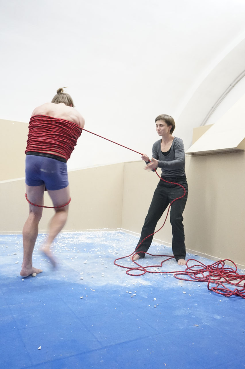 Schnüren, zuschnüren, abschnüren, einschnüren - all diese Begriffe tragen etwas Haltbares, Sicheres und Vertrautes, zugleich aber auch etwas Brutales und Verletzliches. Ob bei sexuellen Neigungen, Extremsportarten oder auf See, das Seil schnürt den Ablauf der Situation. Sich eingeschnürt zu fühlen, ans Bett gefesselt, keinen Ausweg zu sehen. Abgeschnürt vom Treiben der Sozialstrukturen. 40 Meter Seil werden unter ständiger Rotation um den Torso des Künstlers gewickelt, um gezielt den Aspekt des Luftabschnürens zu veranschaulichen.